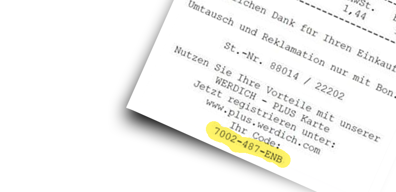 Geben Sie die 3, durch den Bindestrich getrennten Codeblöcke in die entsprechenden Felder ein und klicken anschließend auf den Button "Kassenbon Ihrem WERDICH PLUS Konto zuweisen".